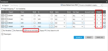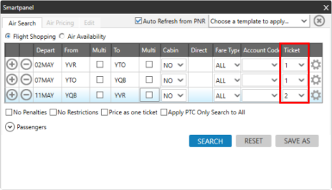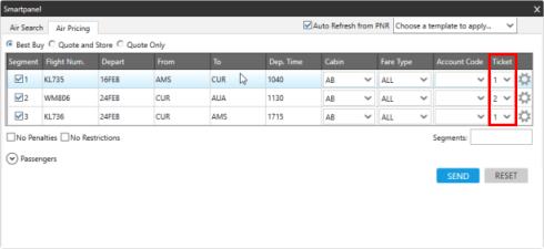 Lorsque vous demandez une recherche d’achat de vols ou la tarification des billets d’avion dans Smartpanel, vous pouvez fractionner la billetterie pour les segments aériens.