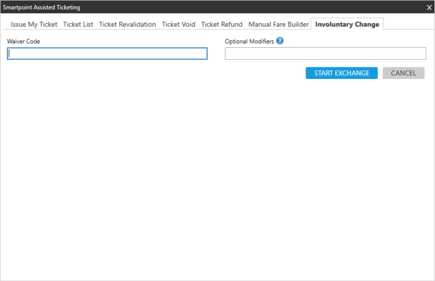La billetterie assistée fournit une interface utilisateur qui permet d’apporter des modifications involontaires aux billets. Utilisez l’onglet Changement involontaire dans la billetterie assistée pour ajouter des modificateurs avant d’envoyer la demande d’échange.