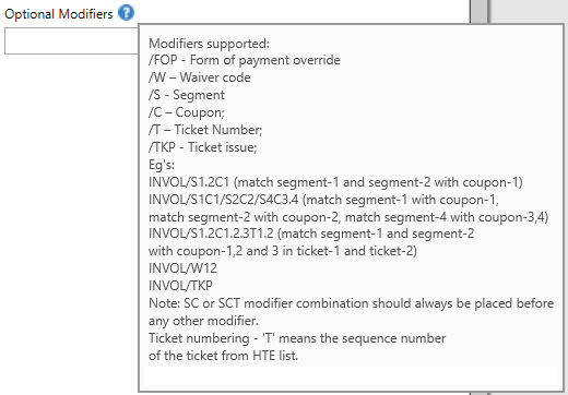 Optionnel. Dans Modificateurs facultatifs, saisissez un ou plusieurs modificateurs de billetterie. Les agents peuvent cliquer sur l’icône Aide pour afficher la liste des modificateurs et des exemples pris en charge.