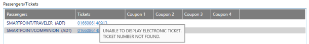 Dans le visualiseur PNR, (*THE), le numéro de billet est toujours affiché. Toutefois, dans la billetterie assistée, si un numéro de ticket non valide est demandé, un message s’affiche lorsqu’un agent survole le numéro de ticket :