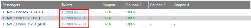 Une liste de tous les billets émis pour PNR/Fichier de réservation s’affiche. Les billets sont regroupés par passager.