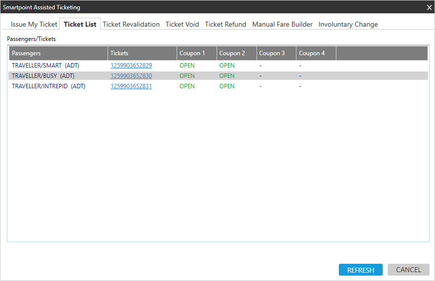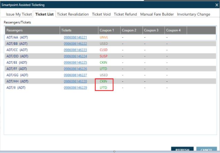 Pourboire! Vous pouvez cliquer sur ACTUALISER pour mettre à jour la liste avec les informations les plus récentes du système Travelport+ (1G).Exemple de statuts de tickets et de multi-statuts