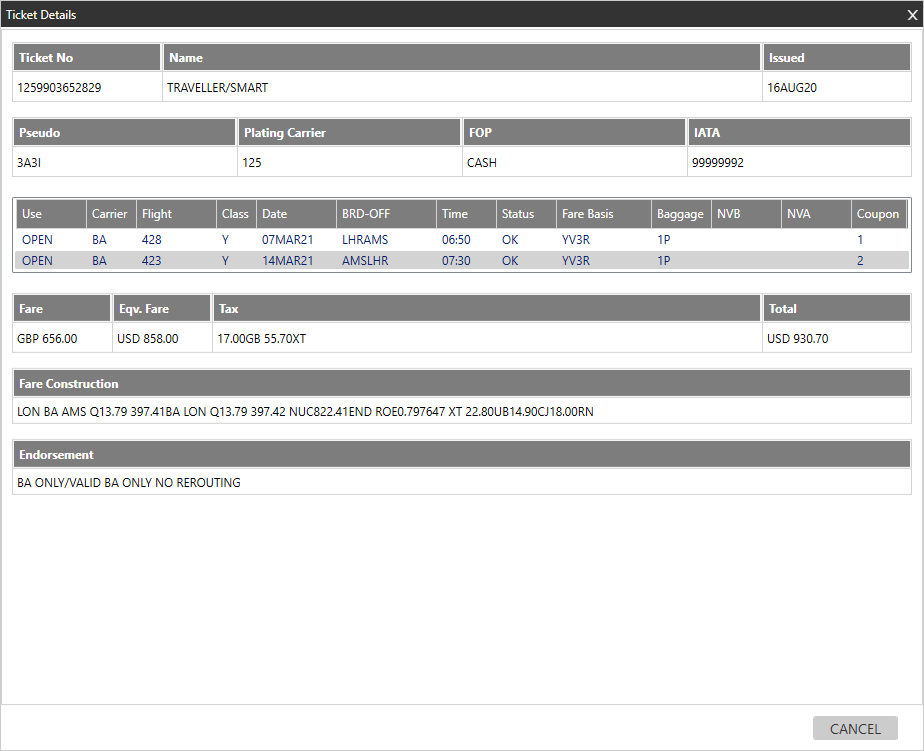 Sélectionnez l’onglet Liste de tickets . L’exemple suivant montre un fichier PNR/réservation avec deux tickets ouverts.