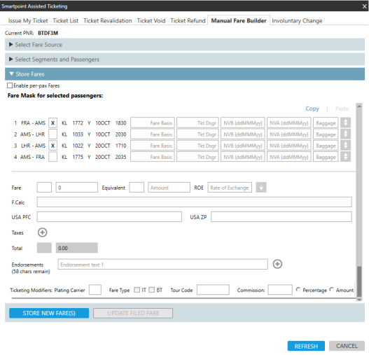 Sélectionnez l’onglet Générateur de tarifs manuel . L’exemple suivant montre un fichier PNR/réservation avec deux tickets ouverts.