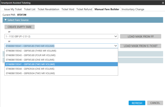 Développez Sélectionner la source tarifaire pour afficher une liste de tous les tarifs déposés et billets électroniques disponibles dans le fichier PNR/réservation.