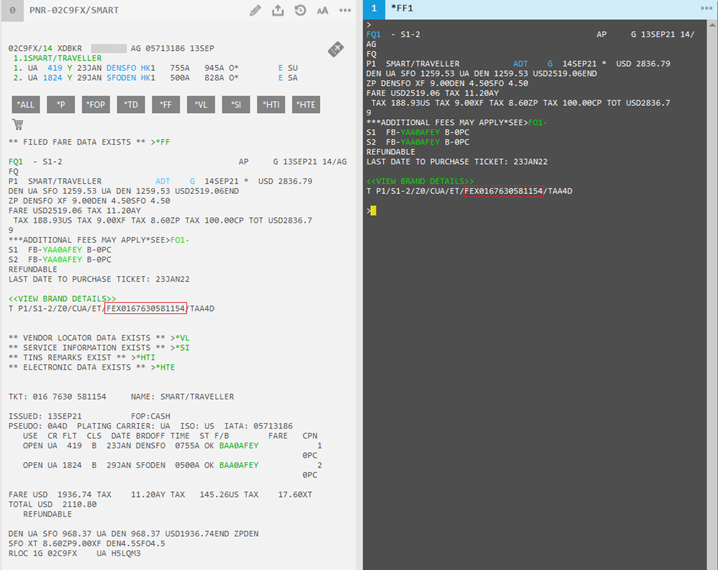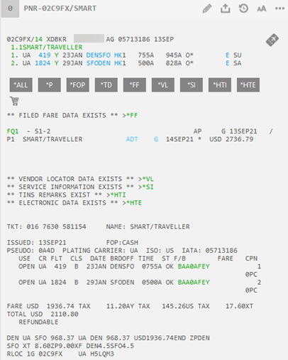 Pour les billets d’échange, les nouvelles informations sur le billet et le statut d’échange sont affichés. L’exemple suivant montre le PNR/Fichier de réservation mis à jour pour les billets d’échange et les billets réémis.