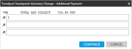 Cliquez sur CONTINUER pour afficher le troisième écran de paiement supplémentaire pour le mode de paiement. Par défaut, le mode de paiement du billet d’origine est affiché. Toutefois, ces informations doivent être modifiées si un autre mode de paiement est utilisé.
