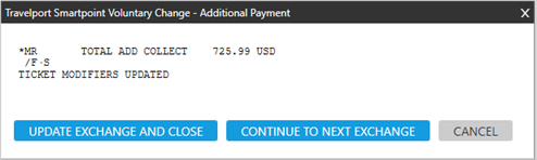 Cliquez sur CONTINUER VERS L’ÉCHANGE SUIVANT pour enregistrer les mises à jour du modificateur de billet ou les détails de l’échange. La billetterie assistée reste ouverte et vous pouvez commencer un autre échange.