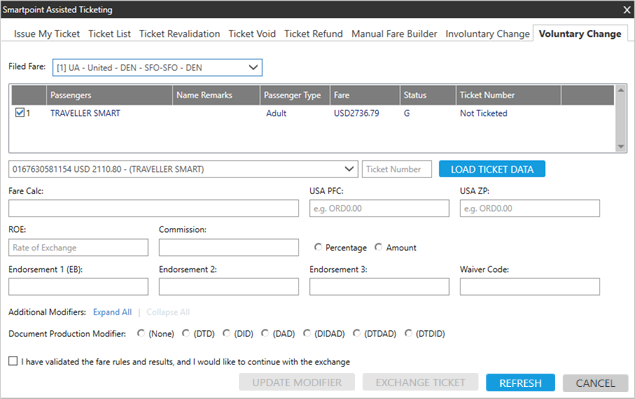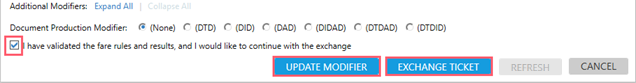 L’option Mettre à jour les modificateurs permet aux agents de mettre à jour et d’enregistrer les modificateurs de ticket et d’autres détails d’échange sans émettre de ticket. Plus tard, les agents peuvent réémettre le billet en utilisant les formats Travelport+ (1G) dans les entrées natives ou Smartpoint.