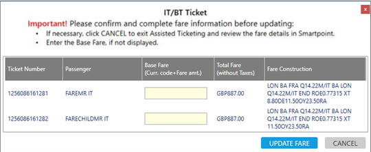 Note: Les réémissions de tarifs IT/BT ne peuvent pas être effectuées par le biais de la billetterie assistée. Les agents peuvent réémettre le billet en utilisant les formats Travelport+ (1G) dans les entrées natives ou Smartpoint.