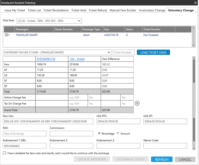 L’option Échanger le billet enregistre les détails de l’échange, tels que les mises à jour des modificateurs de billet, et réémet également le billet pour l’échange.