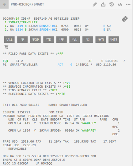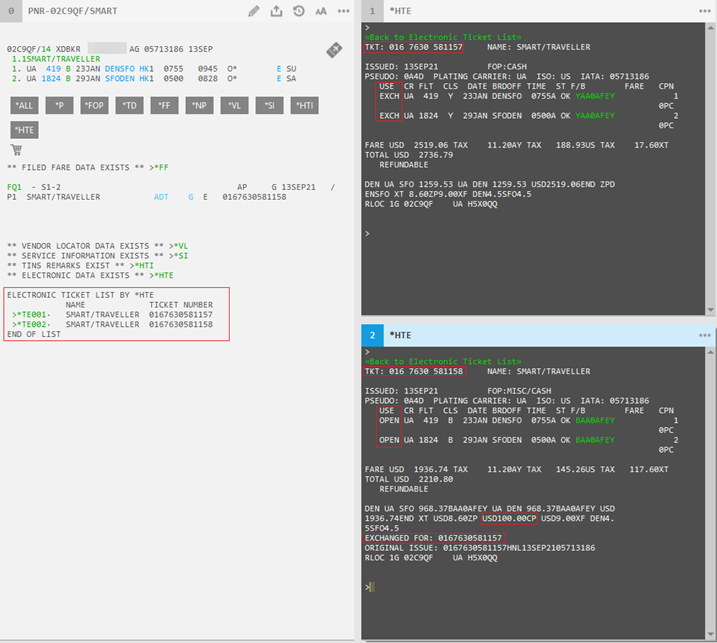 Pour les billets d’échange, les nouvelles informations sur le billet et le statut d’échange sont affichés. L’exemple suivant montre le PNR/Fichier de réservation mis à jour pour les billets d’échange et les billets réémis.