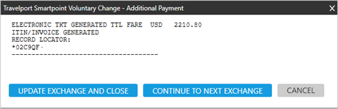 Cliquez sur CONTINUER VERS L’ÉCHANGE SUIVANT pour enregistrer les mises à jour du modificateur de billet ou les détails de l’échange. La billetterie assistée reste ouverte et vous pouvez commencer un autre échange.
