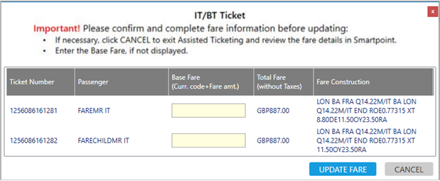 Note: Les réémissions de tarifs IT/BT ne peuvent pas être effectuées par le biais de la billetterie assistée. Les agents peuvent réémettre le billet en utilisant les formats Travelport+ (1G) dans les entrées natives ou Smartpoint.