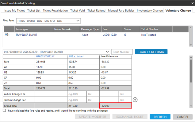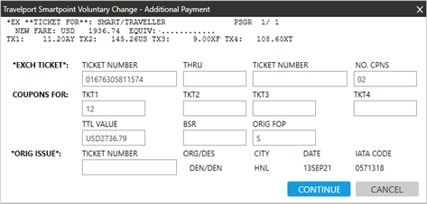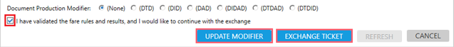 L’option Mettre à jour les modificateurs permet aux agents de mettre à jour et d’enregistrer les modificateurs de ticket et d’autres détails d’échange sans émettre de ticket. Plus tard, les agents peuvent réémettre le billet aux formats Travelport+ (1G) en utilisant des entrées natives d’hôte ou Smartpoint.