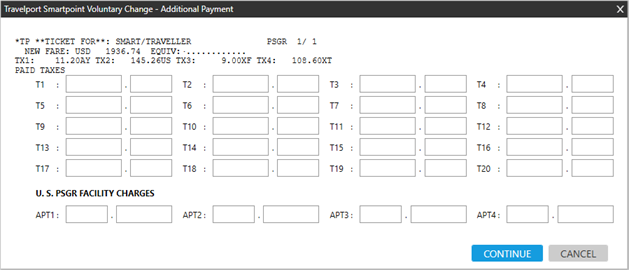 Cliquez sur CONTINUER pour afficher le deuxième écran de paiement supplémentaire, qui contient les taxes payées et les frais d’installation pour les passagers américains. Les champs fiscaux sont automatiquement renseignés, mais peuvent être modifiés.