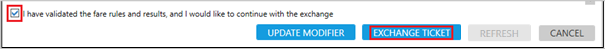 Cliquez sur ÉCHANGER LE BILLET pour afficher le message de confirmation du tarif manuel.