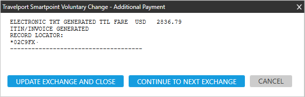 Cliquez sur CONTINUER VERS L’ÉCHANGE SUIVANT pour enregistrer les détails de l’échange. La billetterie assistée reste ouverte et vous pouvez commencer un autre échange.
