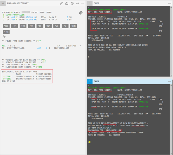 Le PNR/Fichier de réservation et les détails du billet affichent les informations sur le nouveau billet et le statut de l’échange.