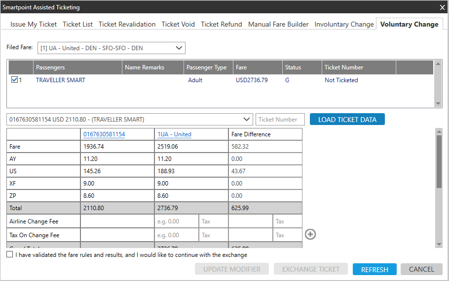 Cliquez sur CHARGER LES DONNÉES DU TICKET pour afficher le tableau de comparaison. Ce tableau permet de comparer côte à côte le billet et le tarif enregistré, tandis que la troisième colonne affiche la différence entre le tarif initial et le nouveau tarif.
