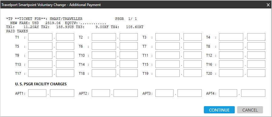 Cliquez sur CONTINUER pour afficher le deuxième écran de paiement supplémentaire, qui contient les taxes payées et les frais d’installation pour les passagers américains. Les champs fiscaux sont automatiquement renseignés, mais peuvent être modifiés.