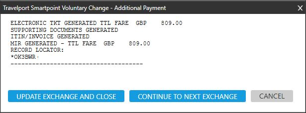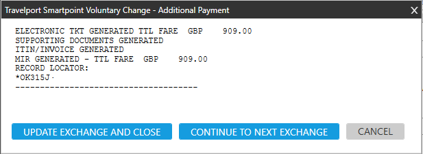 Cliquez sur CONTINUER VERS L’ÉCHANGE SUIVANT pour enregistrer les détails de l’échange. La billetterie assistée reste ouverte et vous pouvez commencer un autre échange.