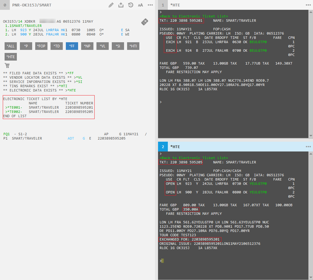 Le PNR/Fichier de réservation et les détails du billet affichent les informations sur le nouveau billet et le statut de l’échange.
