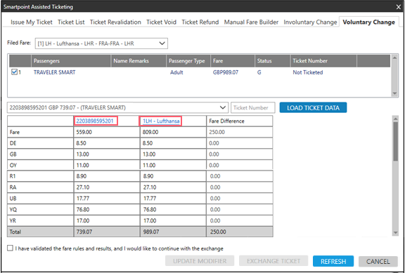 Cliquez sur CHARGER LES DONNÉES DU TICKET pour afficher le tableau de comparaison. Ce tableau permet de comparer côte à côte le billet et le tarif enregistré, tandis que la troisième colonne affiche la différence entre le tarif initial et le nouveau tarif.