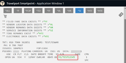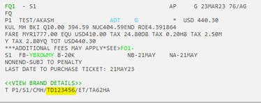 Si vous cliquez sur ÉMETTRE UN BILLET – TKP, la valeur de l’indicatif du billet est ajoutée dans le cadre de la ligne de code de base tarifaire (FBC) du billet électronique émis. Le modificateur n’est pas mis à jour dans le tarif enregistré.