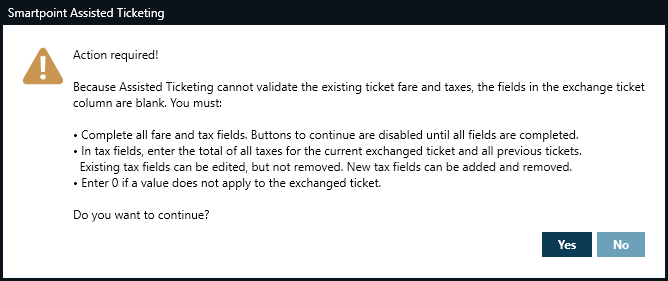 Étant donné que la billetterie assistée ne peut pas valider le prix du billet et les taxes, les champs de la colonne d’échange sont vides.