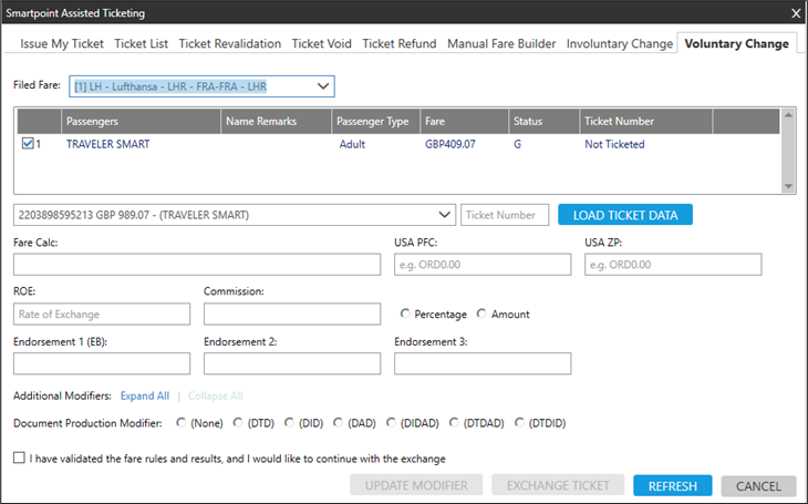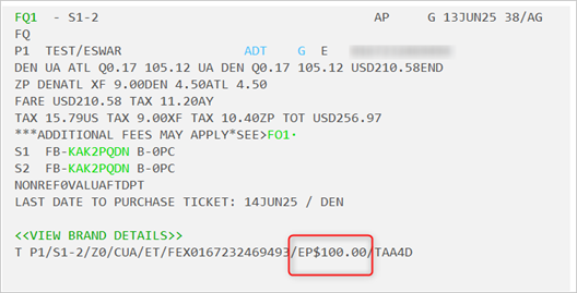 Dans les transactions ARC, le montant perdu/ignoré est considéré avec les frais de changement de compagnie aérienne comme modificateur EP$ , de sorte que le montant est correctement inclus dans le calcul de l’échange. Le modificateur EP$ est ajouté dans la ligne T du tarif enregistré (tarif classé) si le modificateur est mis à jour avant l’échange. Le modificateur est considéré en interne lorsque l’échange de billets est tenté directement.