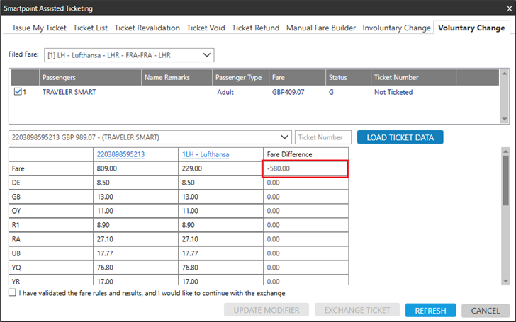 Cliquez sur CHARGER LES DONNÉES DU TICKET pour afficher le tableau de comparaison. Ce tableau permet de comparer côte à côte le billet et le tarif enregistré, tandis que la troisième colonne affiche la différence entre le tarif initial et le nouveau tarif.