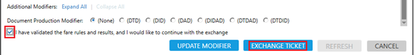 Cliquez sur ÉCHANGER LE BILLET pour afficher le message de confirmation du tarif manuel.