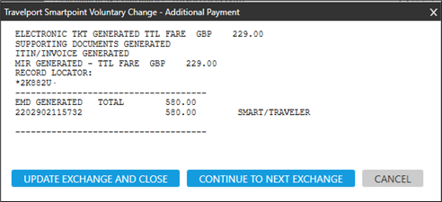Cliquez sur CONTINUER VERS L’ÉCHANGE SUIVANT pour enregistrer les détails de l’échange. La billetterie assistée reste ouverte et vous pouvez commencer un autre échange.
