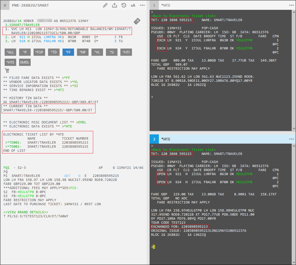 Le PNR/Fichier de réservation et les détails du billet affichent les informations sur le nouveau billet et le statut de l’échange.