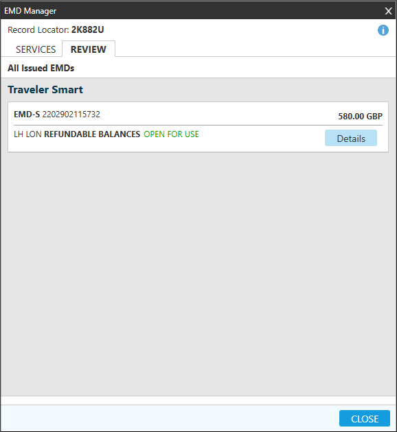 Cliquez sur CONTINUER pour afficher la page de confirmation, qui indique que l’EMD de solde remboursable et le billet ont été émis. Un segment de service pour le solde remboursable EMD est automatiquement ajouté au fichier PNR/Réservation.
