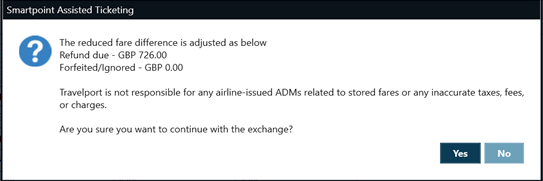 Smartpoint 11.7 et versions ultérieures. Une fois que vous avez sélectionné la validation du tarif, un message contextuel s’affiche pour indiquer un remboursement et tout montant perdu/ignoré, ainsi que pour rappeler que les agents sont responsables de la validation des taxes, des frais et des charges pour éviter les ADM.