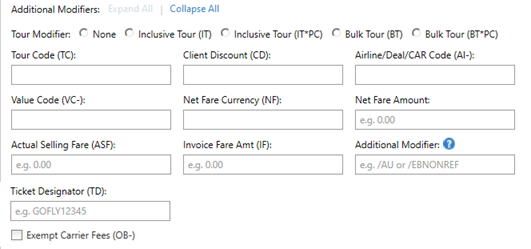 Optionnel. Dans Modificateurs supplémentaires, cliquez sur Développer tout pour saisir d’autres modificateurs de billet facultatifs. Vous pouvez cliquer sur Réduire tout à tout moment pour fermer la section Modificateurs supplémentaires.