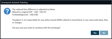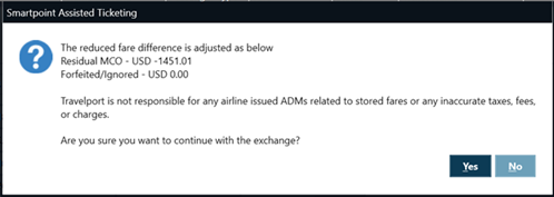 Smartpoint 11.7 et versions ultérieures. Une fois que vous avez sélectionné la validation du tarif, un message contextuel s’affiche pour indiquer les montants de remboursement ou de MCO résiduels et les montants de confiscation/ignorance, ainsi que pour rappeler que les agents sont responsables de la validation des taxes, des frais et des charges afin d’éviter les ADM.