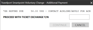 Dans les transactions ARC, le montant perdu/ignoré est considéré avec les frais de changement de compagnie aérienne comme modificateur EP$ , de sorte que le montant est correctement inclus dans le calcul de l’échange. Le modificateur EP$ est ajouté dans la ligne T du tarif enregistré (tarif classé) si le modificateur est mis à jour avant l’échange. Le modificateur est considéré en interne lorsque l’échange de billets est tenté directement.