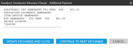 Cliquez sur CONTINUER VERS L’ÉCHANGE SUIVANT pour enregistrer les détails de l’échange. La billetterie assistée reste ouverte et vous pouvez commencer un autre échange.