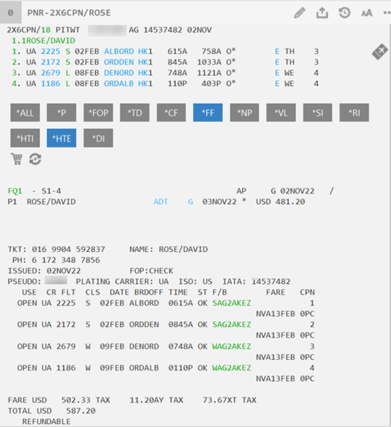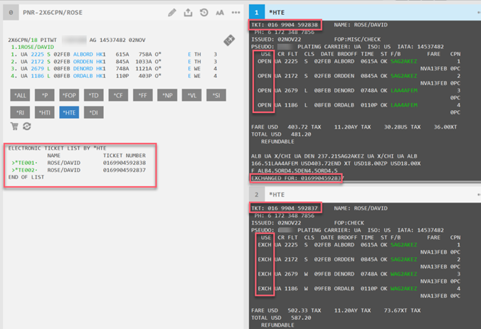 L’exemple suivant montre le PNR/Fichier de réservation mis à jour pour un échange de billets.