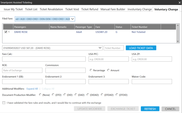 L’onglet Changement volontaire de la billetterie assistée prend en charge la mise à jour des modificateurs et l’échange de billets avec remboursement. Les flux de travail pour la mise à jour des modificateurs et l’échange de tickets sont les mêmes. Par conséquent, cette rubrique combine les deux flux de travail.