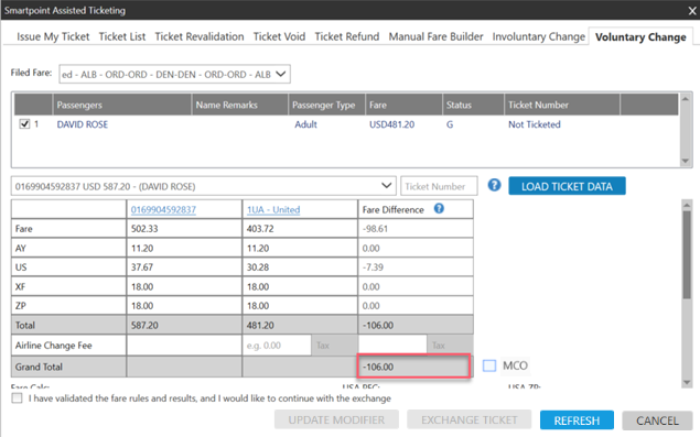 L’option Échanger le billet enregistre les détails de l’échange, tels que les mises à jour des modificateurs de billet, et réémet également le billet pour l’échange.