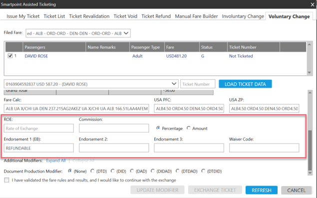 Optionnel. Entrez les modificateurs de billet supplémentaires pour l’échange volontaire.