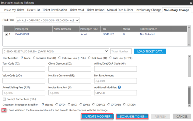 L’option Mettre à jour les modificateurs permet aux agents de mettre à jour et d’enregistrer les modificateurs de ticket et d’autres détails d’échange sans émettre de ticket. Plus tard, les agents peuvent réémettre le billet à partir de la billetterie assistée ou en utilisant les entrées d’hôte Travelport+ (1G) ou Apollo (1V).