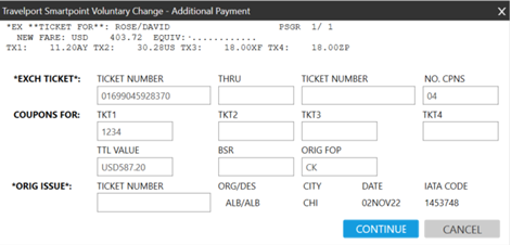 Important!Si vous ne souhaitez pas continuer, vous devez supprimer le tarif enregistré et recommencer.Le premier écran de paiement supplémentaire s’affiche pour afficher les détails du nouveau tarif et les détails du billet échangé. Les détails du billet échangé sont automatiquement renseignés, mais peuvent être modifiés.
