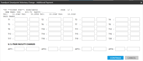Cliquez sur CONTINUER pour afficher le deuxième écran de paiement supplémentaire, qui contient les taxes payées et les frais d’installation pour les passagers américains. La section Taxes payées est vide car les taxes payées ne sont pas désignées dans les billets échangés ARC.