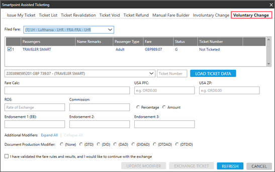 Dans Smartpoint 10.0 et versions ultérieures, les agents peuvent traiter les échanges volontaires et configurer les tarifs à l’aide de l’onglet Changement volontaire de la billetterie assistée.