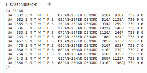 TTDENCHI | Format de base. Affiche les vols directs pour la paire de villes pour un Période de 28 jours à compter de la date actuelle. |